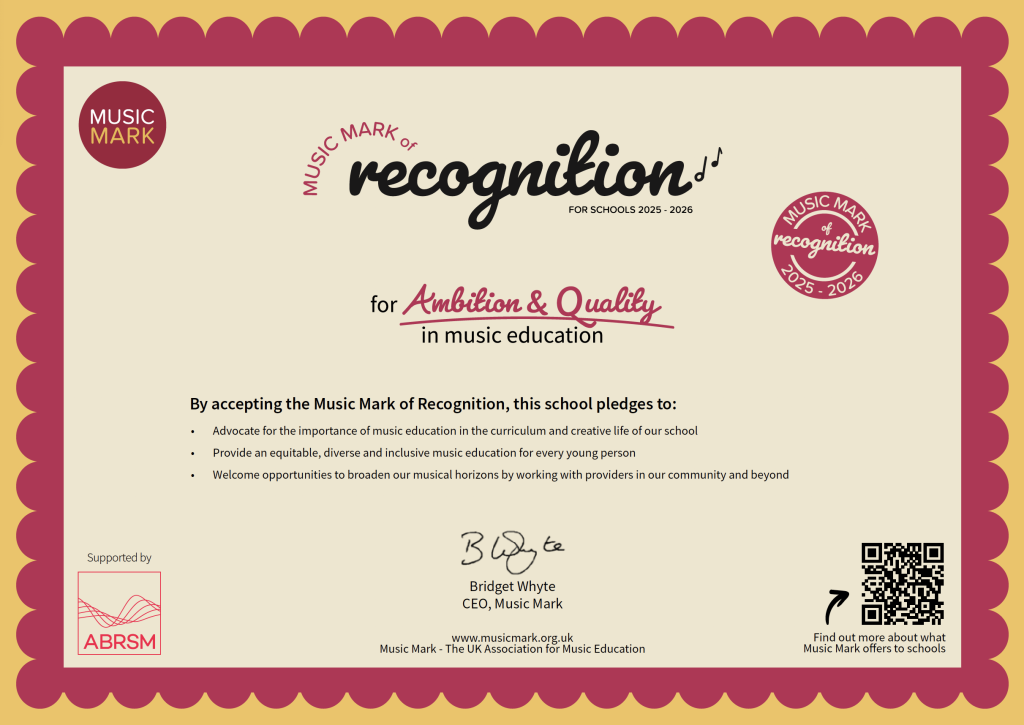 This award, presented by Music Mark – The UK Association for Music Education, celebrates the school’s commitment to ensuring that music plays a central role in enriching the learning and cultural experiences of all pupils.